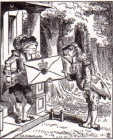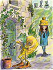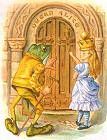 而在『愛麗絲鏡中漫遊』接近尾聲時出現的青蛙則是個門僮。當時愛麗絲已經成為女王,想要走進寫有「愛麗絲女王」的門裡面去