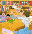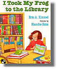 我帶著我的青蛙上圖書館,但是牠跳到借書的櫃台上,嚇壞了圖書館的司書。
