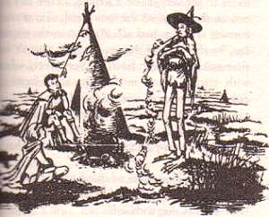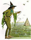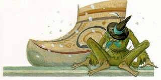 喝醉酒後的普德格蘭,坐姿就和青蛙一模一樣。牠身後是巨人的鞋子。酒是他們到巨人國去時,巨人請他喝的。 |