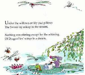 在柳林下的溪流中,有天鵝靠在蓮花枕上睡覺。周圍一片寂靜,只有一些蜻蜓在空中飛舞(還有青蛙在喝下午茶。這是我看圖說故事)。