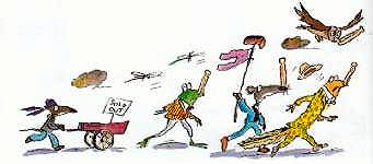 動物們逆風而上,追蹤臭味的來源。由於牠們必須空出手來作事,所以大家都拿出洗衣夾的這項法寶,夾在鼻子上。 |