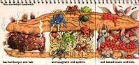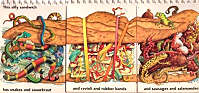 「可笑的三明治」為『蛇和酸高麗菜』+『包餡義大利麵和橡皮筋』+『臘腸和山椒魚』。 |