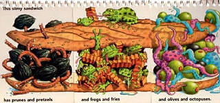 「滑溜溜三明治」為『黑棗和脆餅乾(小布希總統就是吃這種餅乾噎到了)』+『青蛙和薯條』+『橄欖和章魚』。 |