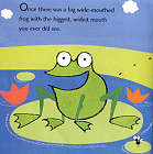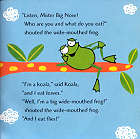 翻開立體書的第一面,就有一隻大嘴蛙出現。牠說:「我是一隻大嘴蛙,我吃蒼蠅」,而牠的嘴巴和舌頭也隨著翻頁而跳到外面來。在舌頭上還畫著一隻蒼蠅!而在平面書則是很傳統的陳述:「從前有一隻大嘴蛙,嘴巴又大又寬,遠超過你的想像。有一天,牠決定出外看世界」。