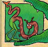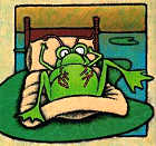 牠覺得這樣非常的有趣,就嚐試著用六隻小腳爬了一下下、用兩隻大綠腳跳了幾下、還用魚尾巴拍打附近的蒼蠅呢。由於牠實在是玩得太入神了,所以就沒有查覺到有一張大嘴巴正在緩緩的接近……。