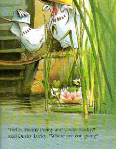 牠走了很久,一直到遇見公雞洛奇(Cocky Locky)為止。亨妮•佩妮告訴牠天要塌了,而自己正要去通知國王這件事。