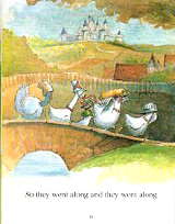 幸運鴨對這兩隻頭頂「鍋盔」的雞感到好奇,問牠們要去那裡。在這兩隻雞的腳下,可以看見兩隻表情可笑的青蛙。 |