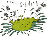 由於牠的體積龐大,所以隨著牠下水的勢頭,也把小蝌蚪們都給彈到荷葉上去了(而且牠還馬上就離開「作案」現場,留下一堆躺著喘氣,第一次出現「無辜」表情的小蝌蚪們)。