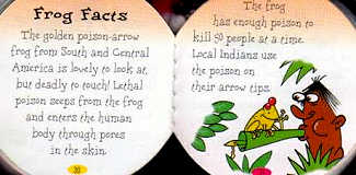 creatures」,介紹的是動物界中既酷又怪又好玩的「事實」,特別是有關於蜘蛛、蛇、蠍子等人人敬而遠之的「五毒」。既然蟾蜍也是五毒的一份子,在這本書中自然也少不了兩棲類。只不過,登場的是箭毒蛙。