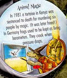 而在「Outrange(射程遠?怪名字!)」這本「書」之中,介紹的就是各種「吊詭的事實」。像在1981年時,在肯亞有一隻陸龜被判死刑,其罪名是「用巫術害死了六個人」;而在德國則是用青蛙當成「壓力計」,因為那裡的青蛙會在氣壓降低時鳴叫。