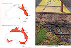 toad的分布範圍,下方的地圖則是預測牠們今後的分布區域。右邊的插圖是這篇故事的插畫,呈現的是主角蟾蜍泰德正在和同伴們玩「捕蛾遊戲」。 |