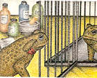 某一天,當牠跳起來要抓一隻「遠在天邊」的蛾時,卻不小心地跳進了緩緩駛出車站的貨車車廂中。從此,牠就展開了一段遙遠而辛苦的冒險,甚至還被科學家給抓進實驗室裡,打算讓牠和實驗室中的母蟾蜍交配,生出更多的小蟾蜍來作實驗喔。