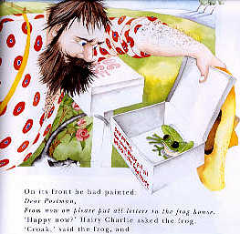 長毛查理拎起那隻青蛙的腳,對牠說:『像你這種青蛙總是會讓我感覺毛毛的。青蛙就該待在草叢裡;信箱是用來裝信的!』,然後把那隻青蛙給丟進了玫瑰叢中。