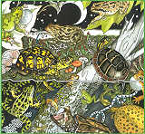 而後,則是「分門別類」地個別介紹了12種青蛙、7種蟾蜍、以及13種烏龜。在每個單種的介紹下,都用很逗趣的插圖描繪出該種動物的長相、棲地、以及食物。