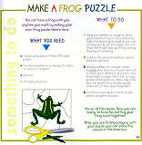 可是最對我味口的,卻是附在每一類動物之後的遊戲。在青蛙的部份,是製作青蛙拼圖。材料只需要一張白色的卡紙、幾隻彩色筆、一把剪刀、以及一個鞋盒。