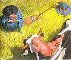 巫婆停在一頭「牛」旁邊問:「小豬們在那裡?」「牛」對她哞哞多聲之後回答:「沒有小豬」