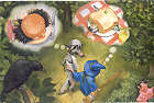 接下來,她告訴狼:「狼先生,我有一個好主意。既然你還沒吃飯、我也還沒吃飯,那你要不要到我家來和我一起吃頓中飯呢?」