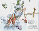 「沼澤的殺手」沒有別人,就是鱷魚!牠和原版的大野狼一樣,也是在聽小紅帽說了生病的外婆的事之後,就先繞道去把外婆給吞到肚子裡,然後再假扮成小紅帽的外婆,準備要把小紅帽也一起吞下肚。不過鴨鴨版小紅帽比原版聰明,完全不必獵人出場,就把鱷魚給炮製得慘兮兮,而且從那以後,就拒絕吃別人餵牠吃的東西,和『海底總動員』裡那三隻吃素的鯊魚有拼呢!大家看看最後一張圖,猜得出小紅帽是用什麼方法自救的嗎?