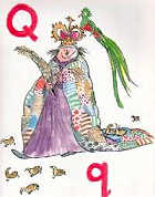 「Q」是由我的偶像-昆丁˙布雷克畫的,他畫了一位拿著鵝毛筆的皇后,而在皇后腳下的拼花被上,還有數隻鵪鶉在走來走去。當然,另一位也常常「害」我「敗家」的Tony