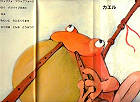 接下來,有號角、手風琴、小提琴等的插圖。而蘇格蘭的風笛聲聽起來像是「卜風卜風卜風、卜風卜風~喔」,在聽見會和肚子起共鳴的蘇格蘭風笛聲後,會讓人連想起會把喉嚨鼓得像是蘇格蘭風笛般大、健康快樂地叫個不停的動物。這個,當然『用膝蓋想』都知道一定是青蛙嘛!對吧。