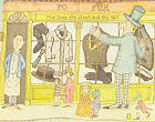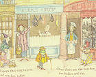 在這一頁的中間下方有一隻帶著草帽、拿著拐杖在散步的帥氣蛙,牠剛經過肉鋪,正要前往糕餅店、蠟燭店,也許還會逛逛帽子店吧。 |