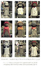 這些「水子地藏」,原本是在路邊讓人祈求小孩的平安的,但是卻有許多好心人士「愛烏及屋」,在替自己的小孩織衣縫圍兜的同時,也會順便替水子地藏穿上一兩件,而形成這種有趣的景象。 |