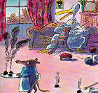 雖然外面下著大雨,鴨子和老鼠卻也只好「冒雨」到外面去吃晚飯,因為牠們有帶傘卻忘了撐。