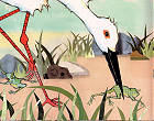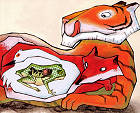 有一隻老虎在湖畔的草叢中睡覺,周圍有許多蟋蟀在跳來跳去。然後,就像「螳螂捕蟬、黃雀在後」一樣的,湖邊的青蛙分頭吃掉許多蟋蟀、白鷺鷥吃掉青蛙、紅狐吃掉白鷺鷥、老虎再吃掉紅狐。