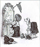 小男孩要跟他的家人出去外面吃晚飯。他就像一般的英國小紳士一樣的,穿上最好的小西裝、打上領帶,把自己打扮得整整齊齊的。可是在一旁的寵物們,像他的狗、青蛙、烏龜卻都一副悶悶不樂的樣子。