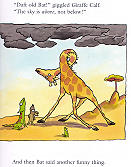 長頸鹿們笑蝙蝠很笨,連天空是在上面也不知道。在長頸鹿的左前腳邊坐著一隻蛙喔,有沒有看見? |